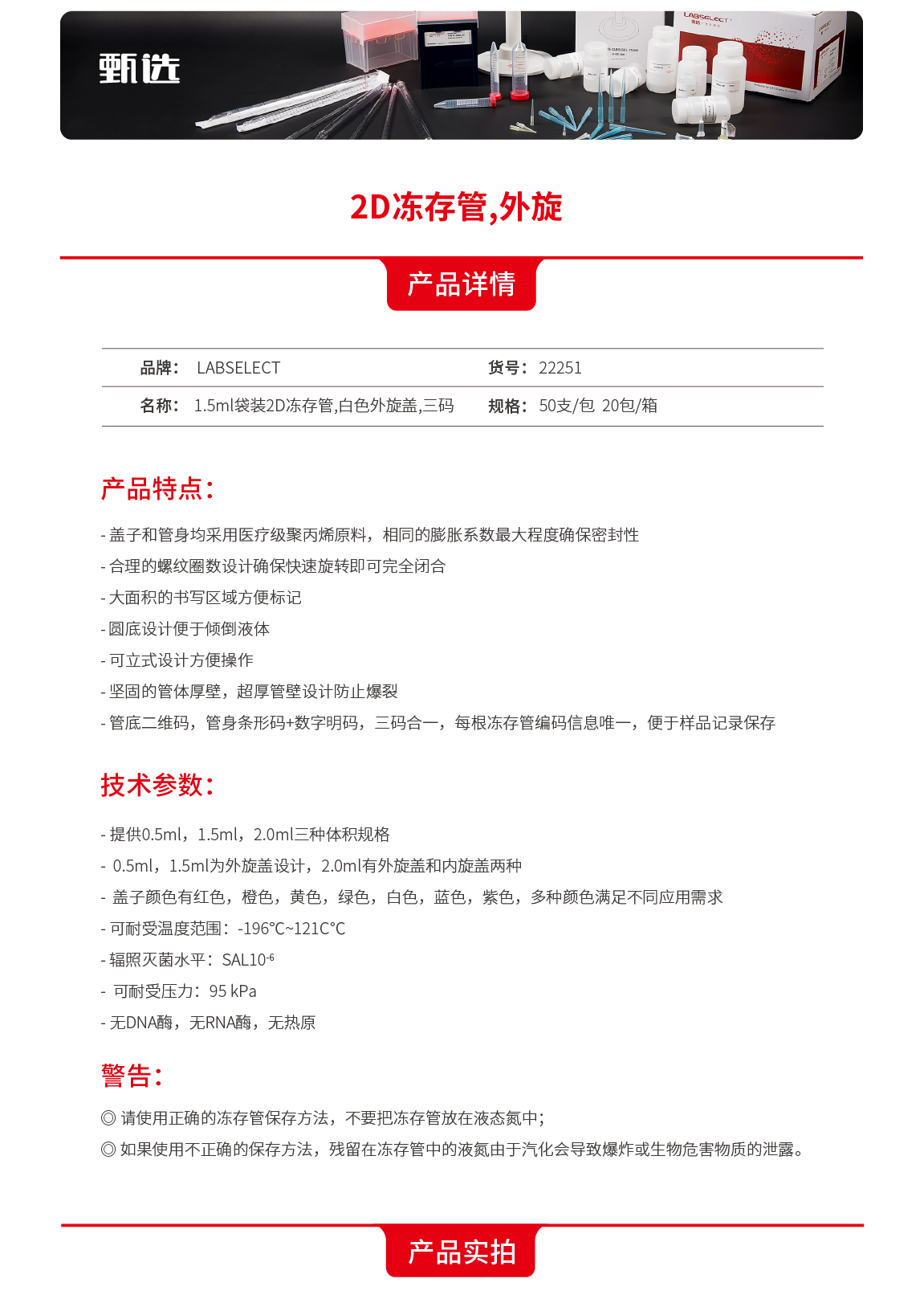 甄选 | 22251 1.5ml袋装2D冻存管,白色外旋盖,三码 | 22251-1 | 20包/箱 | 2-3天 |
