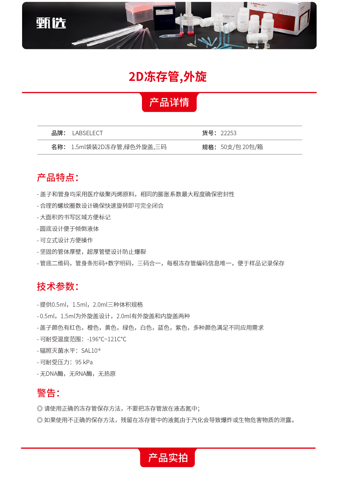 甄选 | 22253 1.5ml袋装2D冻存管,绿色外旋盖,三码 | 22253-1 | 20包/箱 | 2-3天 |