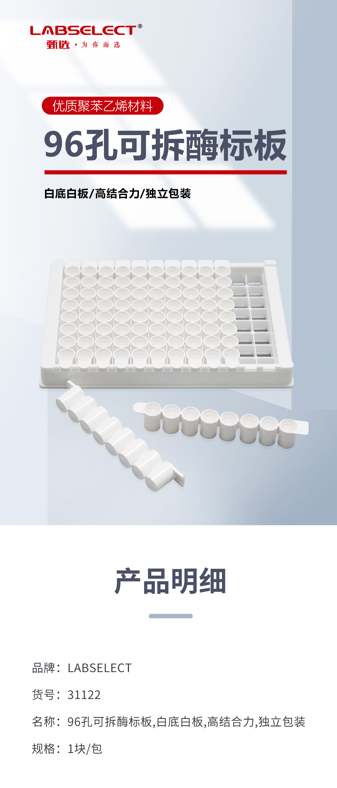 甄选 | 31122 96孔可拆酶标板,白底白板,高结合力,独立包装 | 31122 | 1块/包,50块/箱 | 2-3天 |
