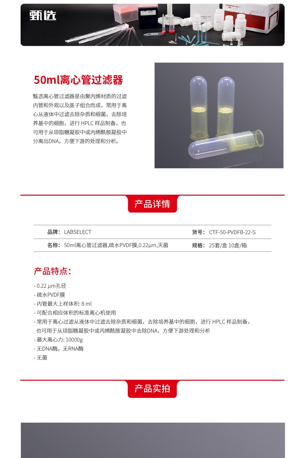 甄选 | CTF-50-PVDFB-22-S 50ml离心管过滤器,疏水PVDF膜,0.22μm,灭菌 | CTF-50-PVDFB-22-S-B | 25套/盒,10盒/箱 | 2-3天 |